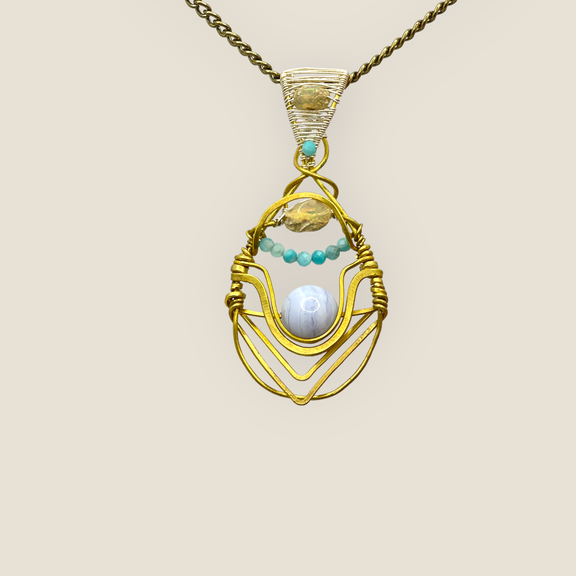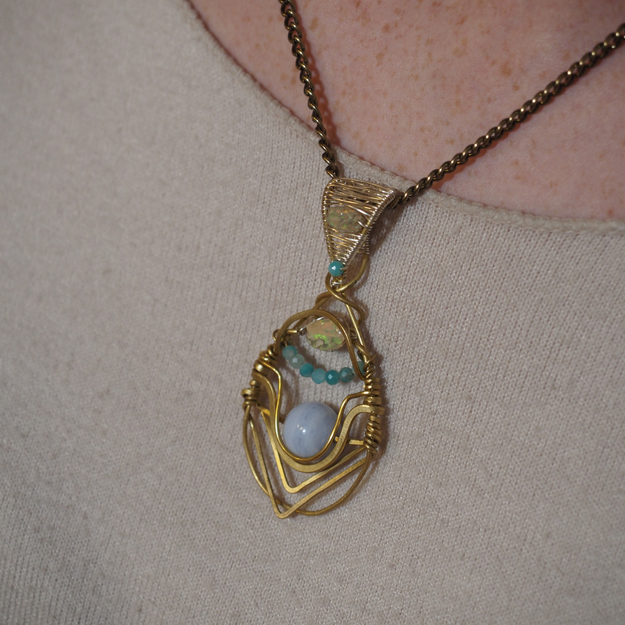 ESAURITO – Pendente in calcedonio azzurro, opale, amazzonite